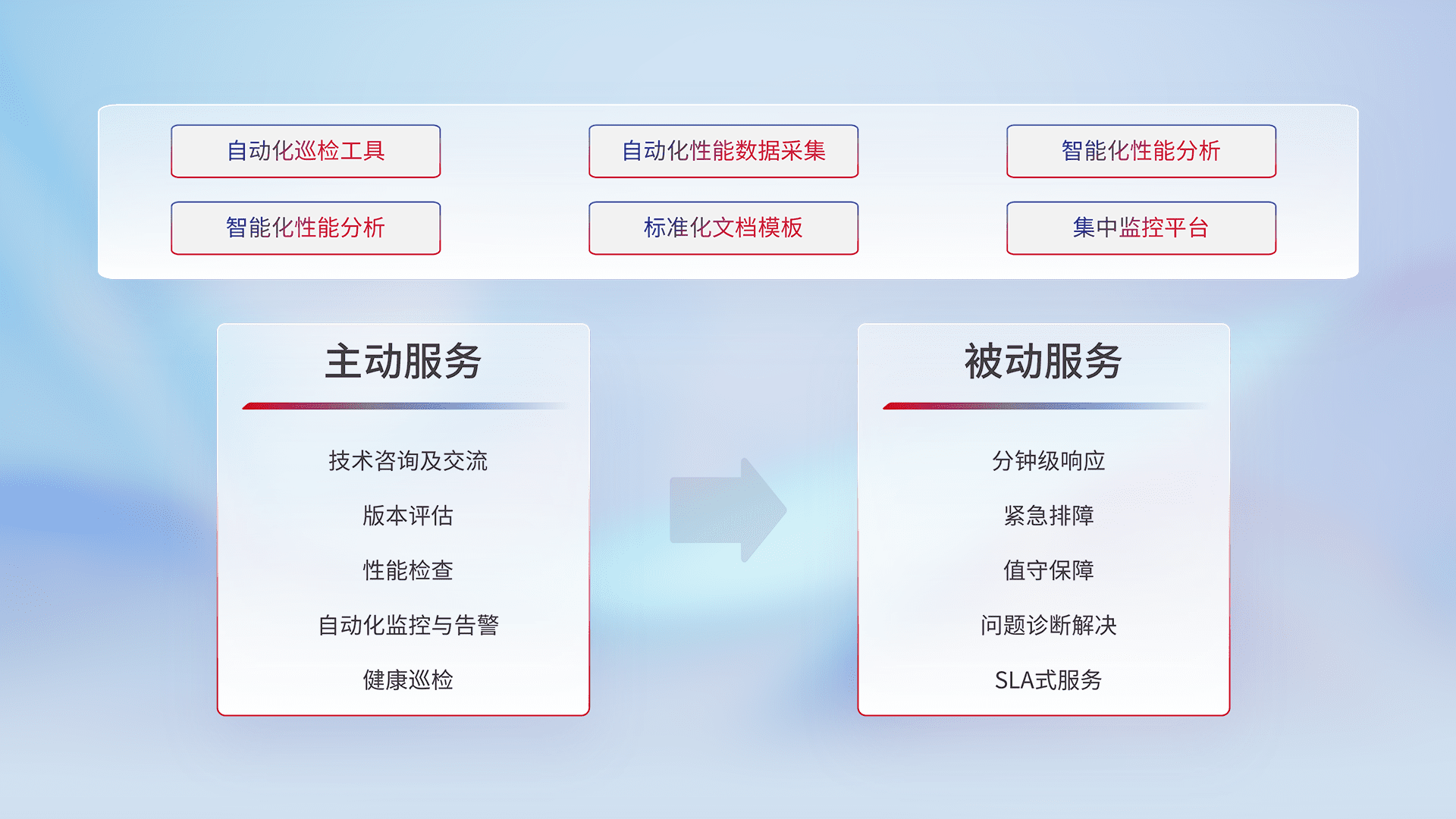 智能化工具和标准化文档,,,保障服务质量,,,提供主动服务(包含技术咨询、、、、版本评估、、、、性能检查、、、、自动化监控与告警、、健康巡检)和被动服务包含(分钟级响应、、、、紧急排障、、值守保障、、、问题诊断解决、、、SLA服务)。。